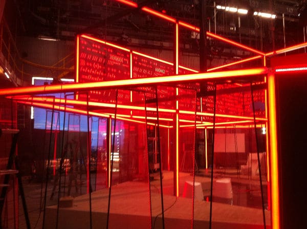 In onze werkplaats te Hilversum hebben we het decor, wat voor een groot deel uit industrieel uitziende H-balken bestond, al voorzien van onze RGB LED verlichting. Tevens waren er een drietal lichtbakken die boven de verschillende desken in de set hangen, die op verzoek van de Belgische lichtontwerper Michiel Milbou voorzien zijn van DMX gestuurde dimbare TL armaturen.