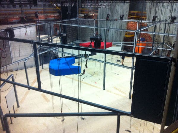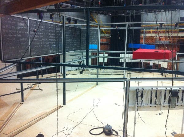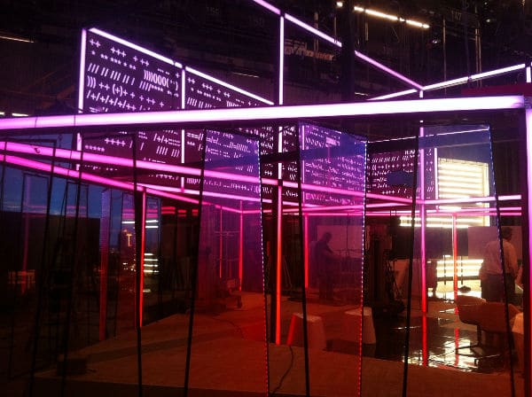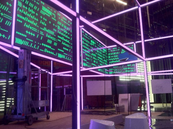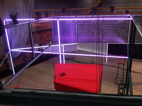 In onze werkplaats te Hilversum hebben we het decor, wat voor een groot deel uit industrieel uitziende H-balken bestond, al voorzien van onze RGB LED verlichting. Tevens waren er een drietal lichtbakken die boven de verschillende desken in de set hangen, die op verzoek van de Belgische lichtontwerper Michiel Milbou voorzien zijn van DMX gestuurde dimbare TL armaturen.